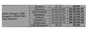 मौजूदा समय-सारणी के अनुसार, यह ट्रेन रात 9:15 बजे बेलगावी से रवाना होती थी और अगली सुबह 6:50 बजे केएसआर बेंगलुरु पहुंचती थी।
