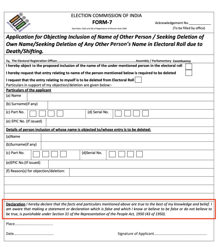 केवल वही व्यक्ति फॉर्म 7 भर सकता है जो उसी निर्वाचन क्षेत्र और भाग में पंजीकृत मतदाता हो. आवेदक को अपना नाम, EPIC संख्या और कारणों सहित प्रमाण प्रस्तुत करने होते हैं, तथा झूठी घोषणा पर लोक प्रतिनिधित्व अधिनियम की धारा 31 के तहत एक वर्ष तक कैद या जुर्माने की सजा हो सकती है.